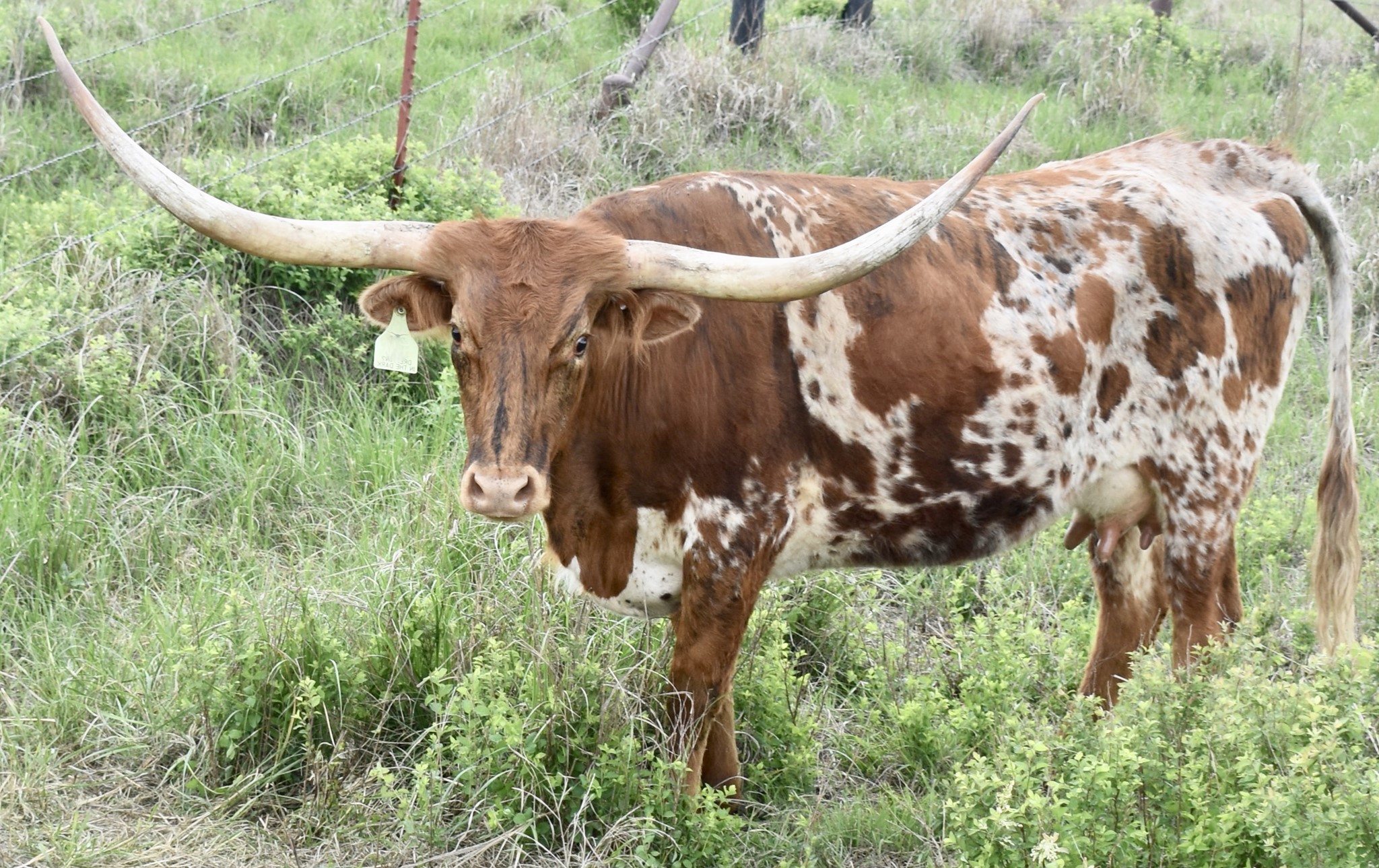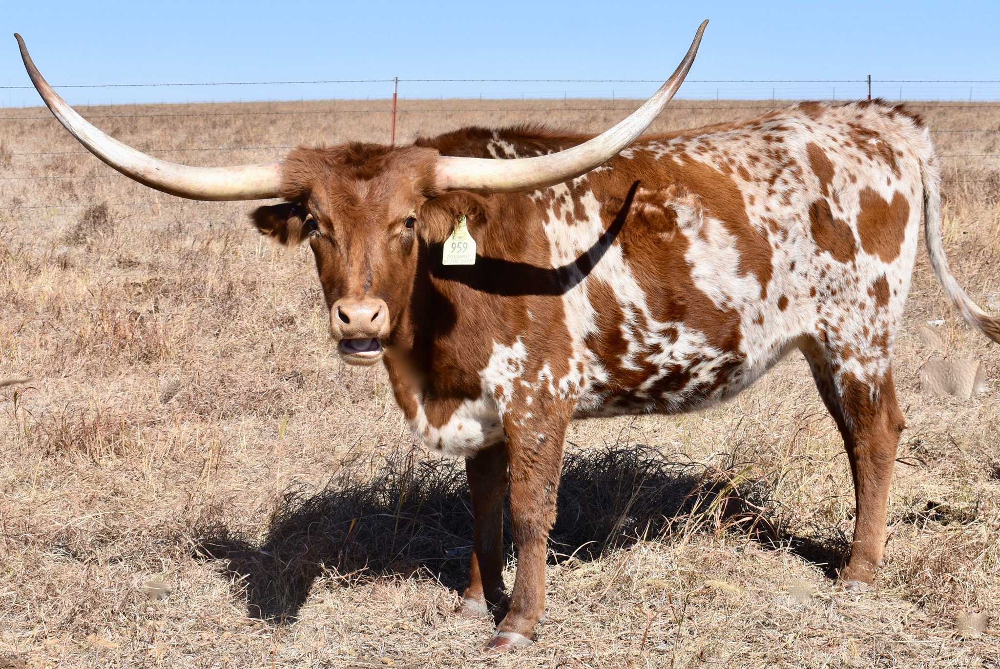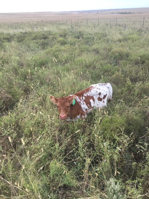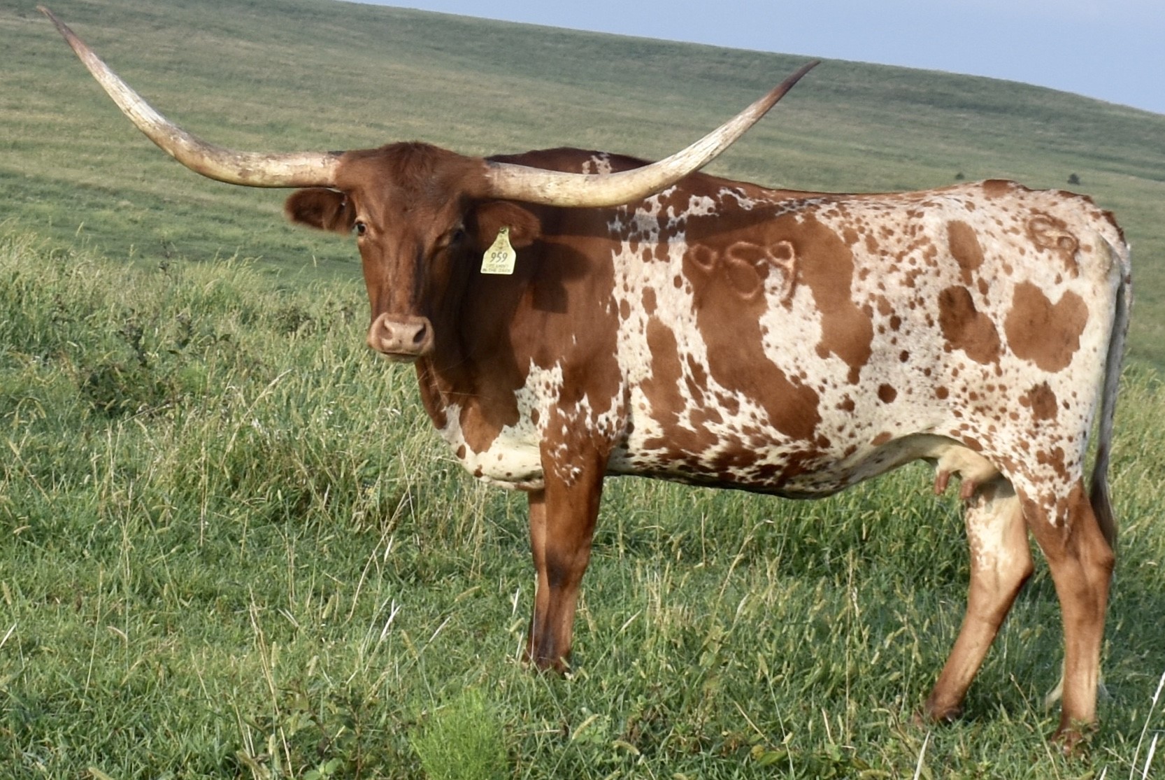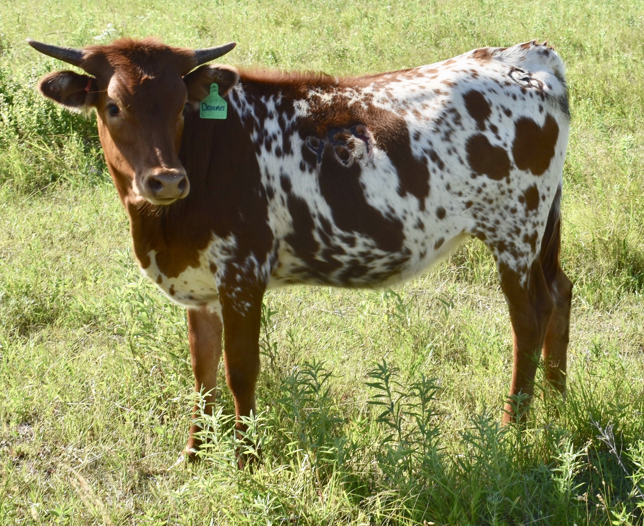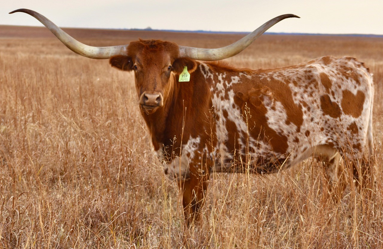 -5 YEAR OLD COLORFUL COW WITH A GREAT PEDIGREE THAT HAS GIVEN US BULL CALVES SO FAR. HER HORNS ARE ROLLING OUT AND WILL BE 80'' SOON. SHE HAS BEEN EXPOSED TO M7 GRATE IRON FOR A SPRING 2025 CALF. MAYBE A HEIFER THIS TIME!