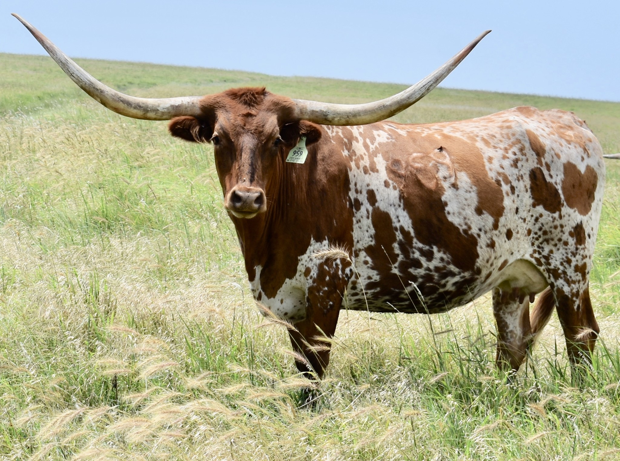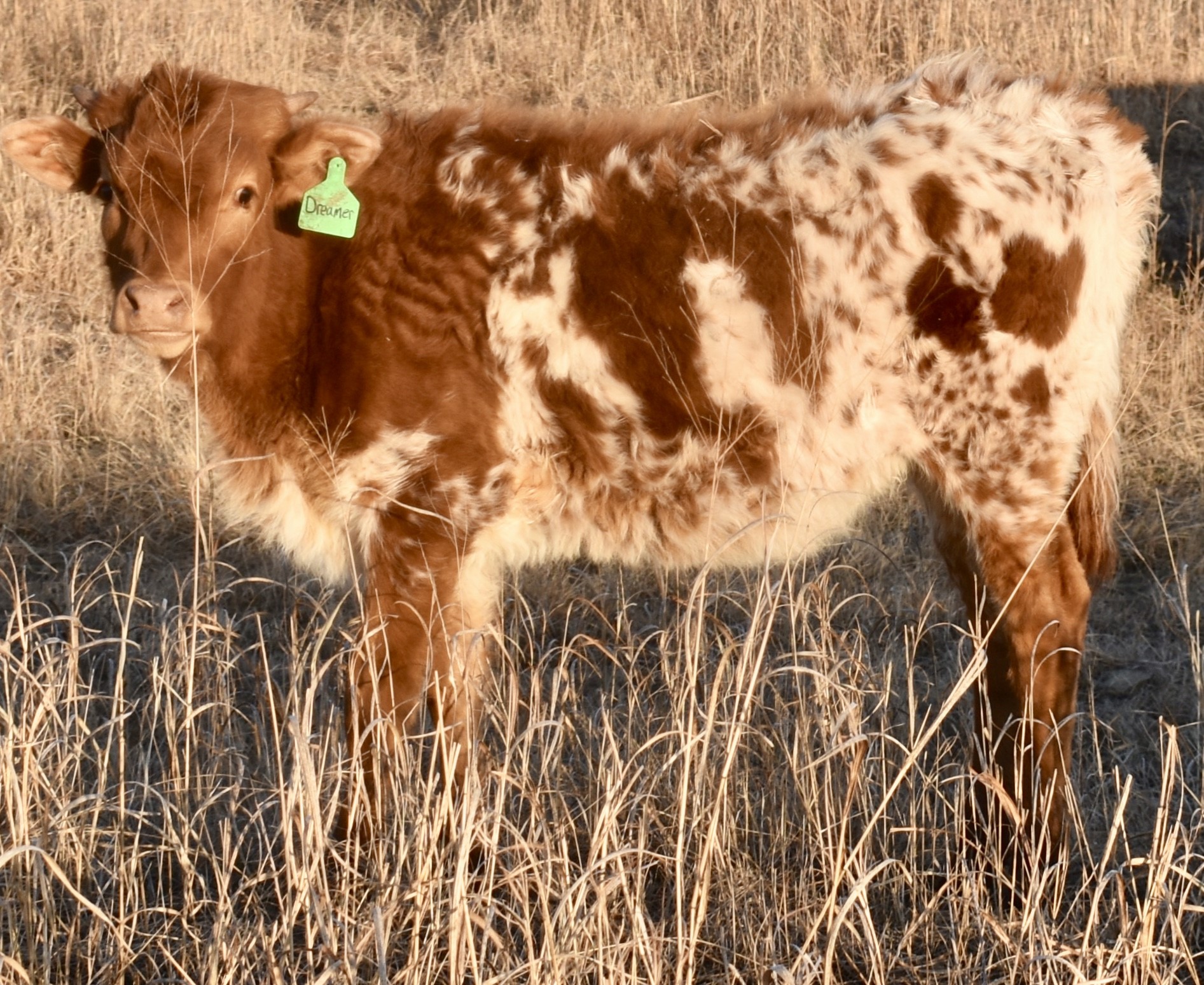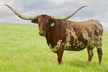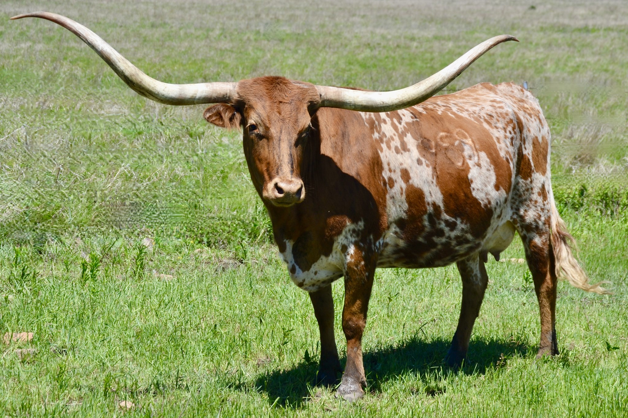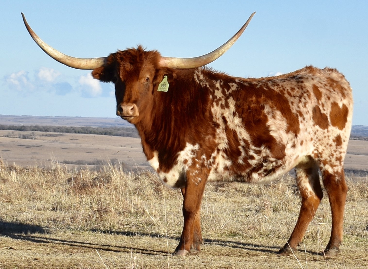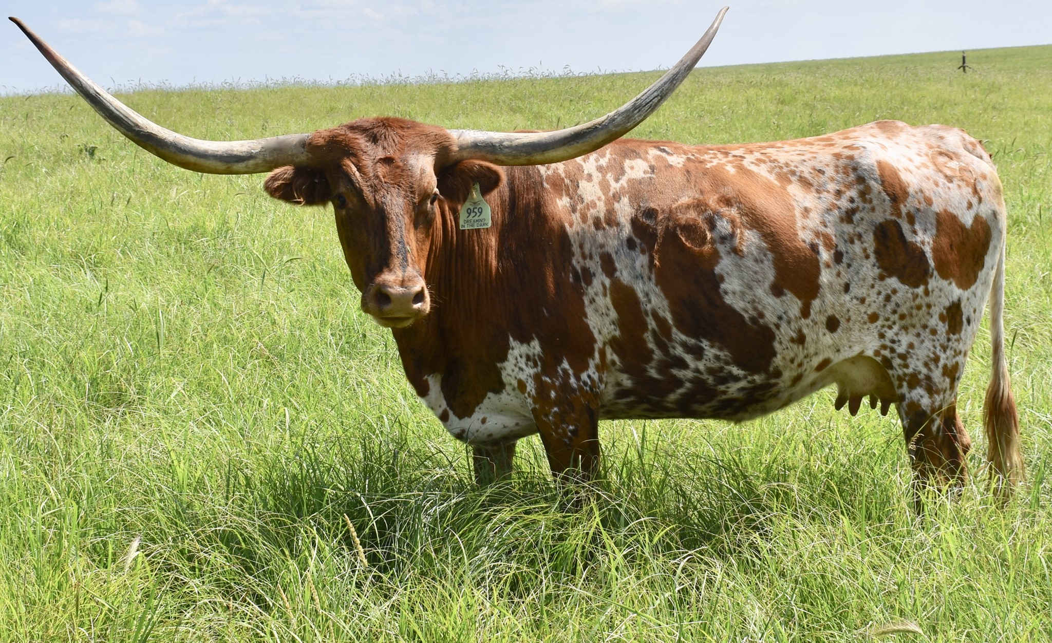 -5 YEAR OLD COLORFUL COW WITH A GREAT PEDIGREE THAT HAS GIVEN US BULL CALVES SO FAR. HER HORNS ARE ROLLING OUT AND WILL BE 80'' SOON. SHE HAS BEEN EXPOSED TO M7 GRATE IRON FOR A SPRING 2025 CALF. MAYBE A HEIFER THIS TIME!