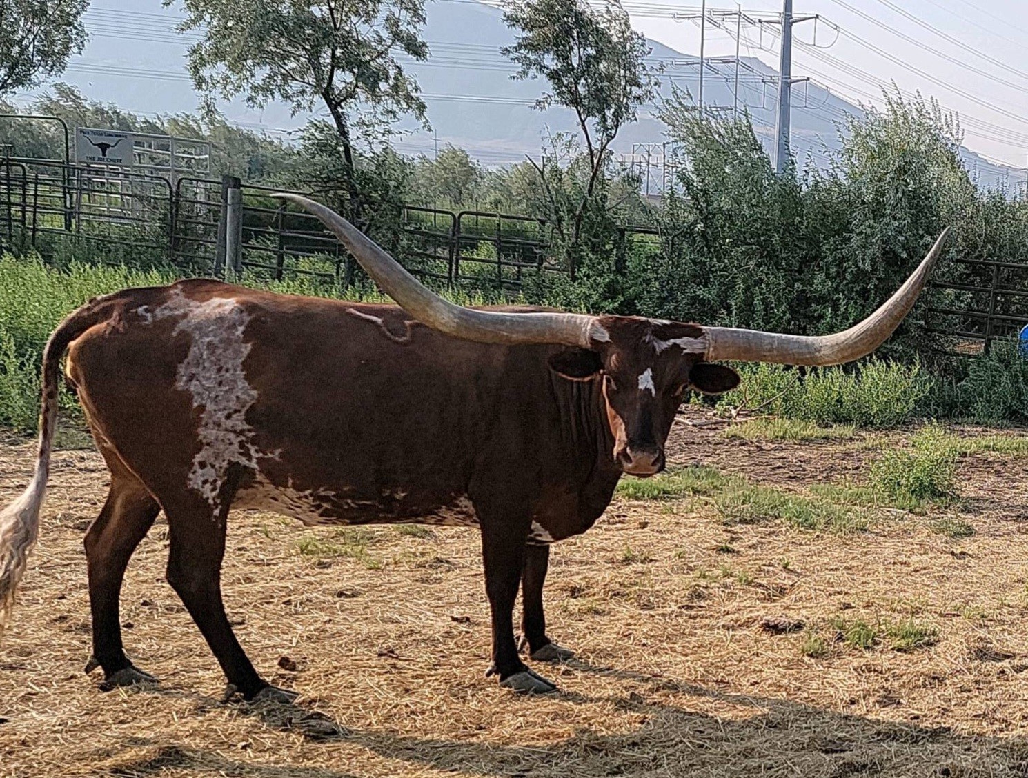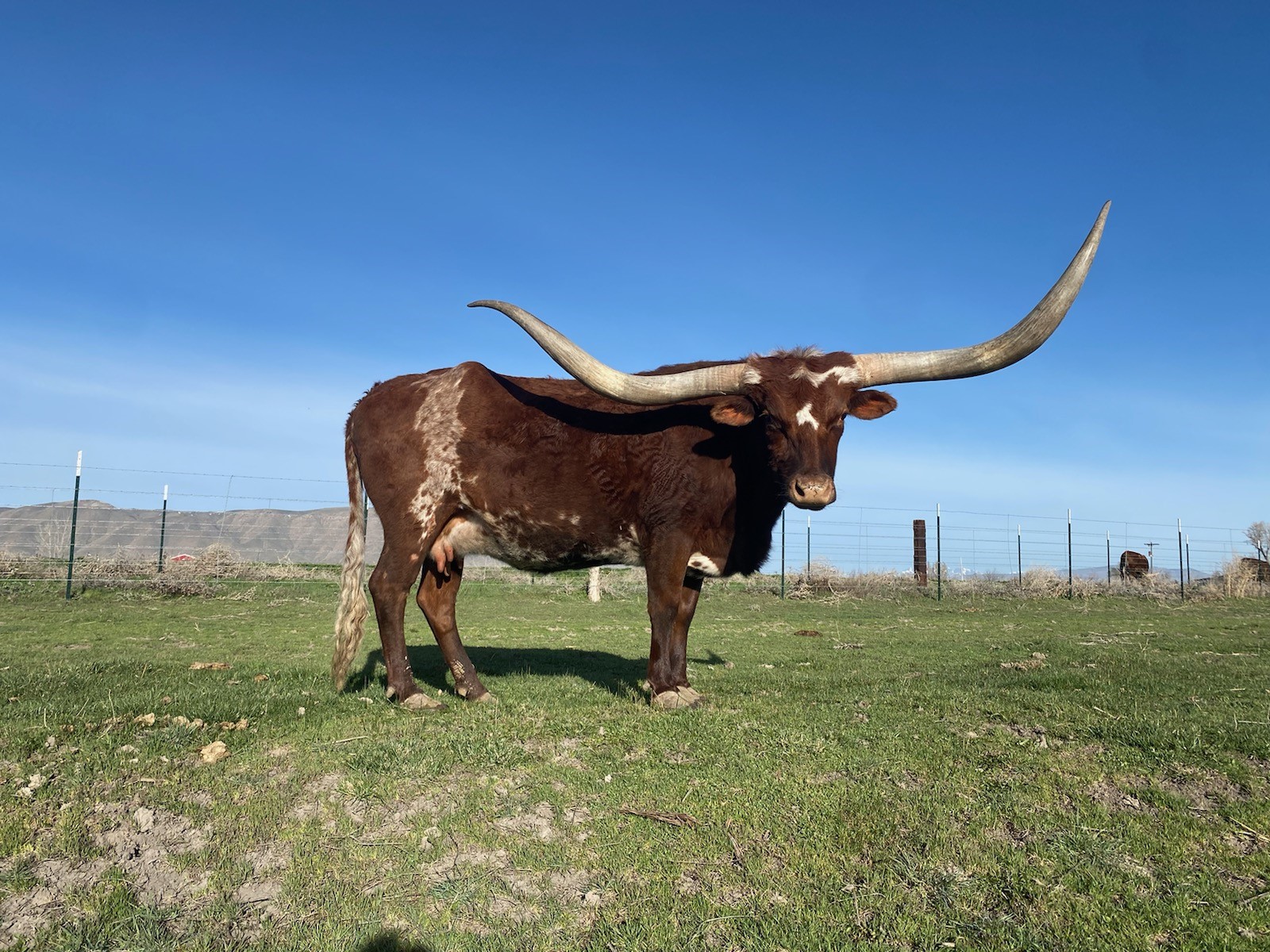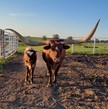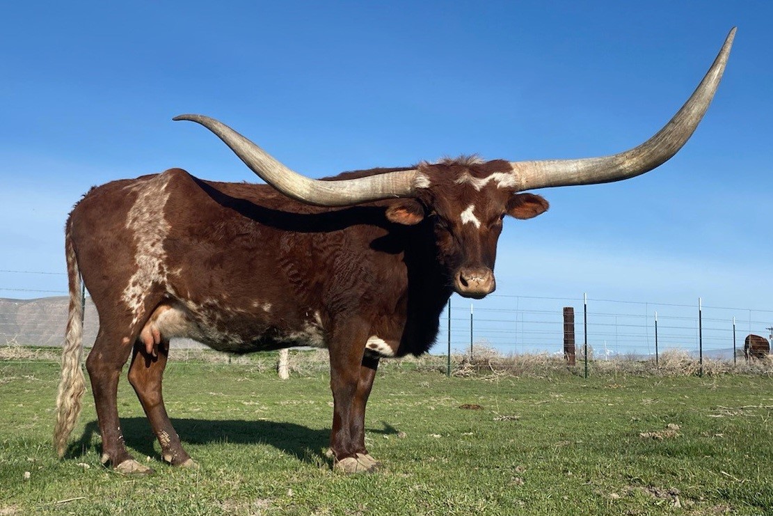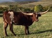 Deep red mahogany color with a load of total horn! She is very sweet and raises big beefy calves.