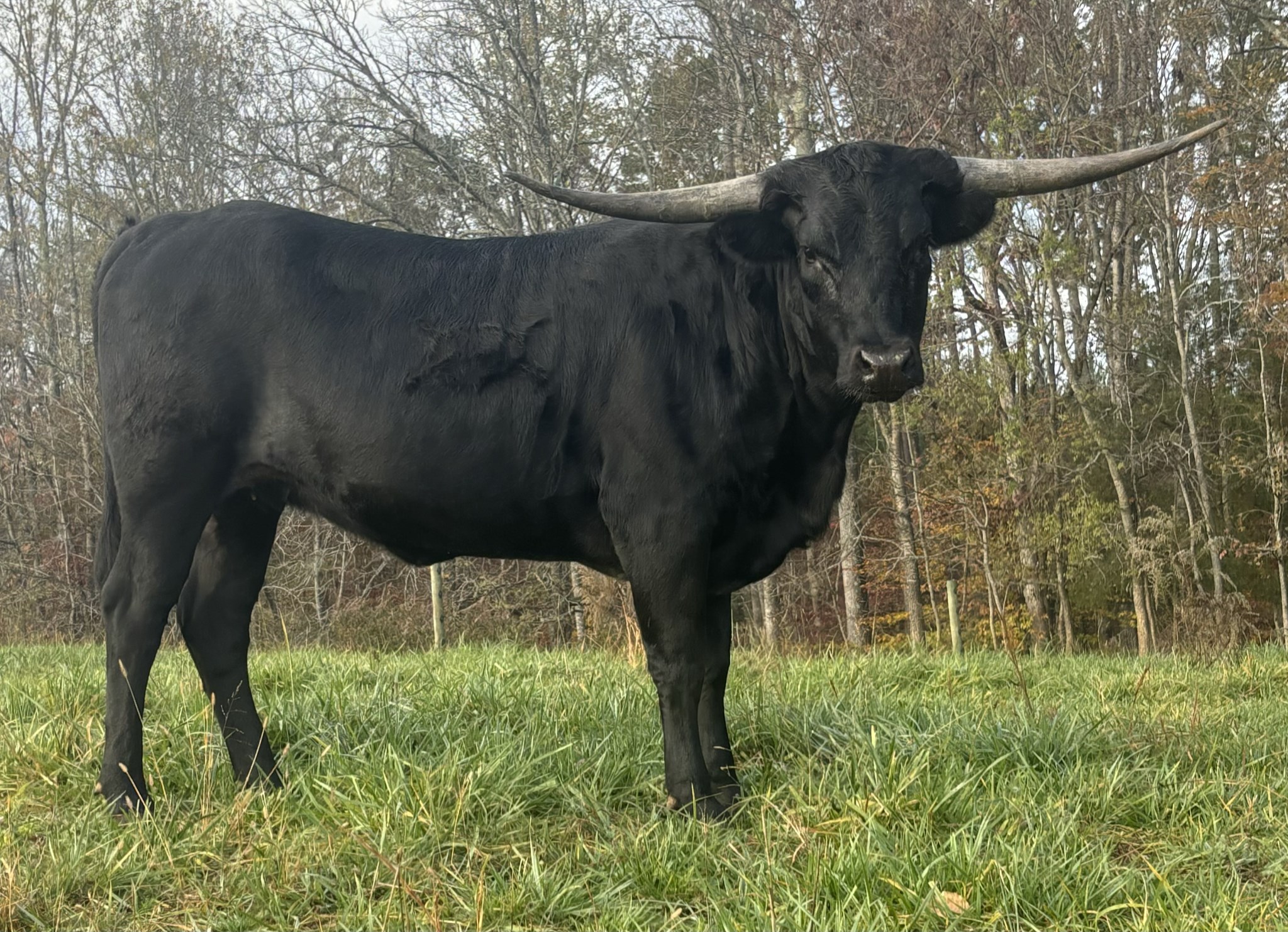 A true black cow with white frosting. Uniquely beautiful. Multiple Longhorn legends in her pedigree!