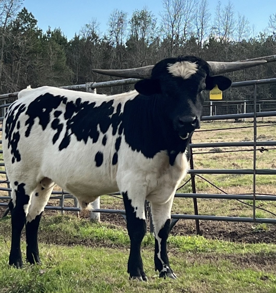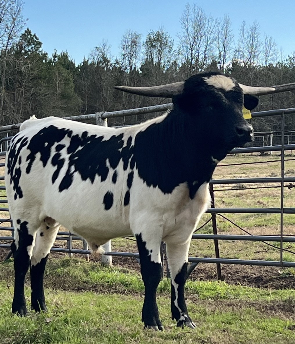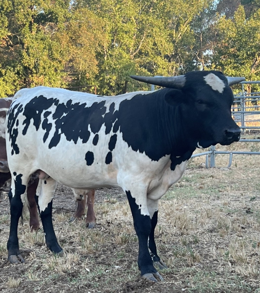 This bull is exciting! His dam is the daughter of the tightest twisted longest horn black and white cow in the breed. His dam is the daughter of Jest Iron as well bringing in the amazing Jester and Drag Iron. The sire to this bull is Captain Cernan, out of SHADOW'S JUBILEE CLONE, and sire is out of BUTTER FEISY LEE, THE LONGEST HORNED CLONE OF DAY'S FEISTY FANNIE. DNA on file; EDe