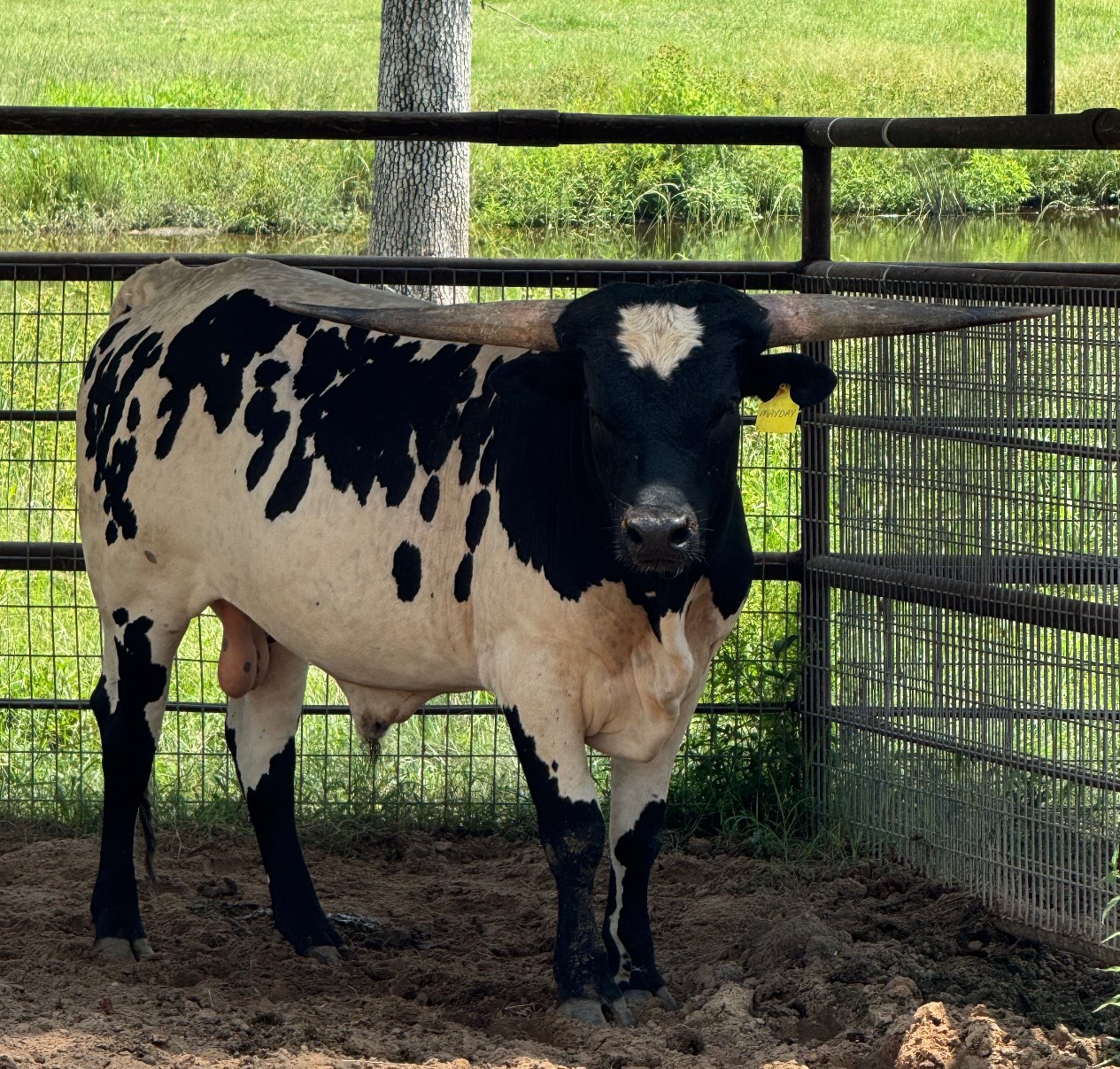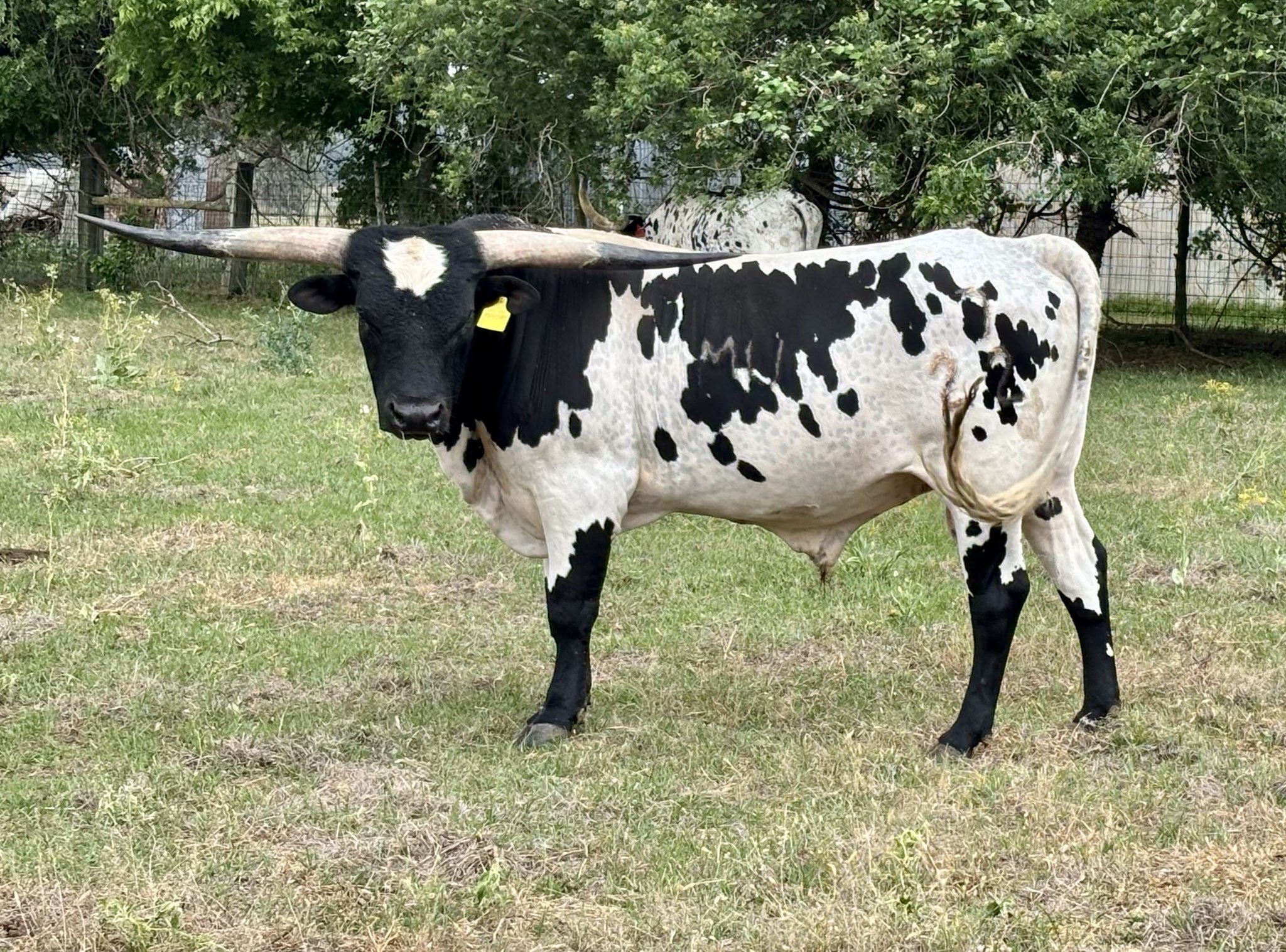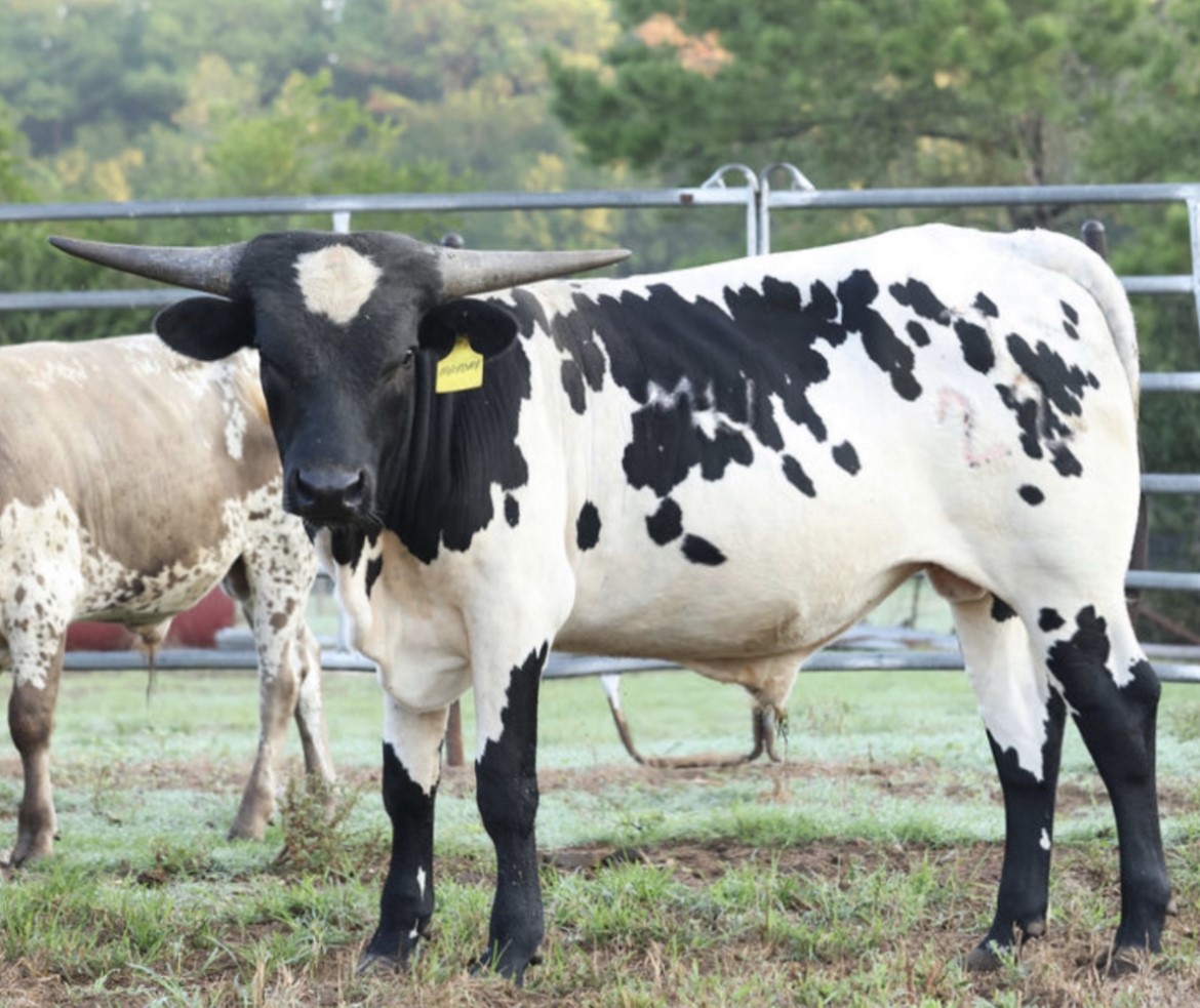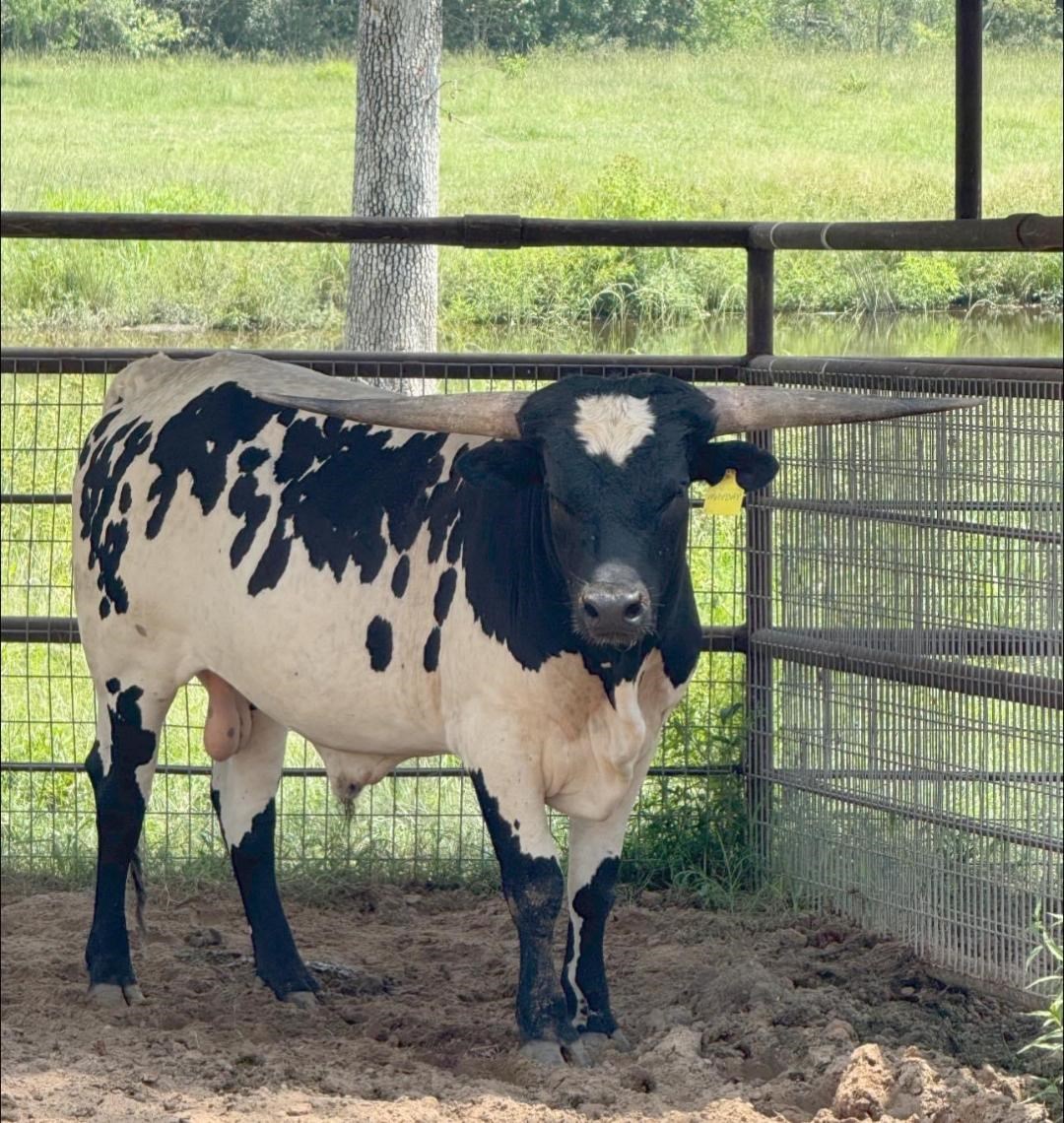 This bull is exciting! His dam is the daughter of the tightest twisted longest horn black and white cow in the breed. His dam is the daughter of Jest Iron as well bringing in the amazing Jester and Drag Iron. The sire to this bull is Captain Cernan, out of SHADOW'S JUBILEE CLONE, and sire is out of BUTTER FEISY LEE, THE LONGEST HORNED CLONE OF DAY'S FEISTY FANNIE. DNA on file; EDe