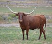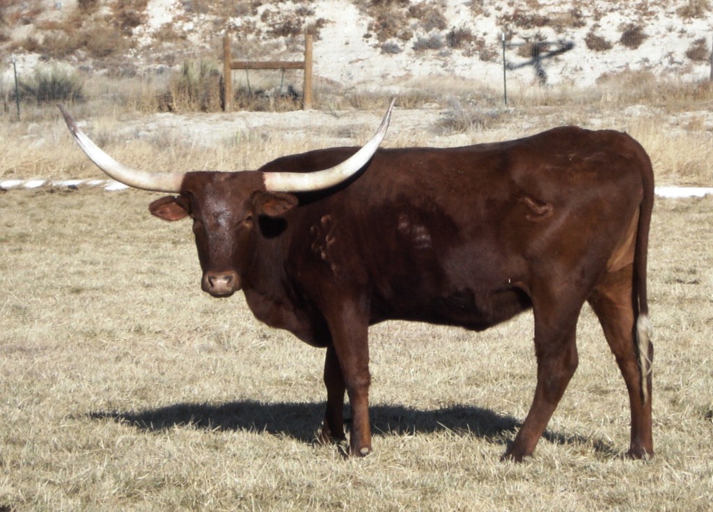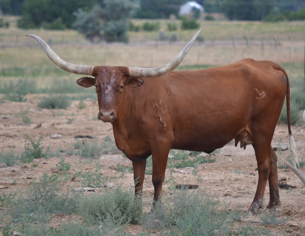 Big horned Gunsmoke daughter. She is a half sister to the great LLL Lucky (same dam) and throws tall, big horned calves. Steer at side by Pacific Cowboy born 4-17-21. Exposed to Hubbells Boss Hog for 2022
