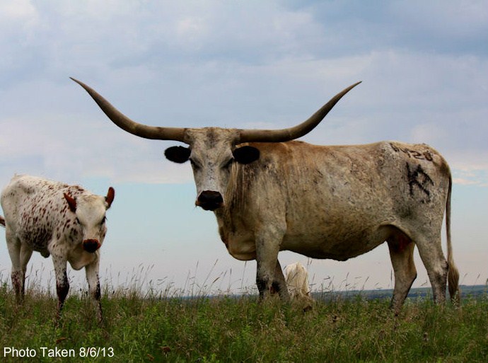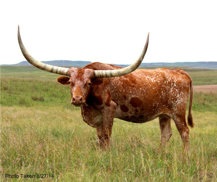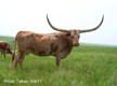 Simply put this is one of the most awe-inspiring cows in the breed. You have to see this cow in person to really get it into prospective. She has horns in the mid 90's TH that lay way back out of her head and has perfect conformation and size. If you want to know what a total package looks like you are looking at one. What really makes this cow stand out in the world is what she has produced. When we bought our herd from Owen McGill we wanted to get a key producing foundation cow and this cow is all that. She has produced well for the McGill/Wilson ranch. Her '09 Top Caliber daughter, Yogurt, is already way into the 60's at a little over 24 months old with the most extreme backward horn angle we have seen. Eggnog is also a 3/4 sister to Trail Dust and is out of the great Hay Hook cow. We have several daughters of Hay Hook and they are all high quality cows. Her 2011 Chuckwagon daughter is on her way to becoming one of the best horned heifers out there. She is also a genetic full sister to Trail Dust.