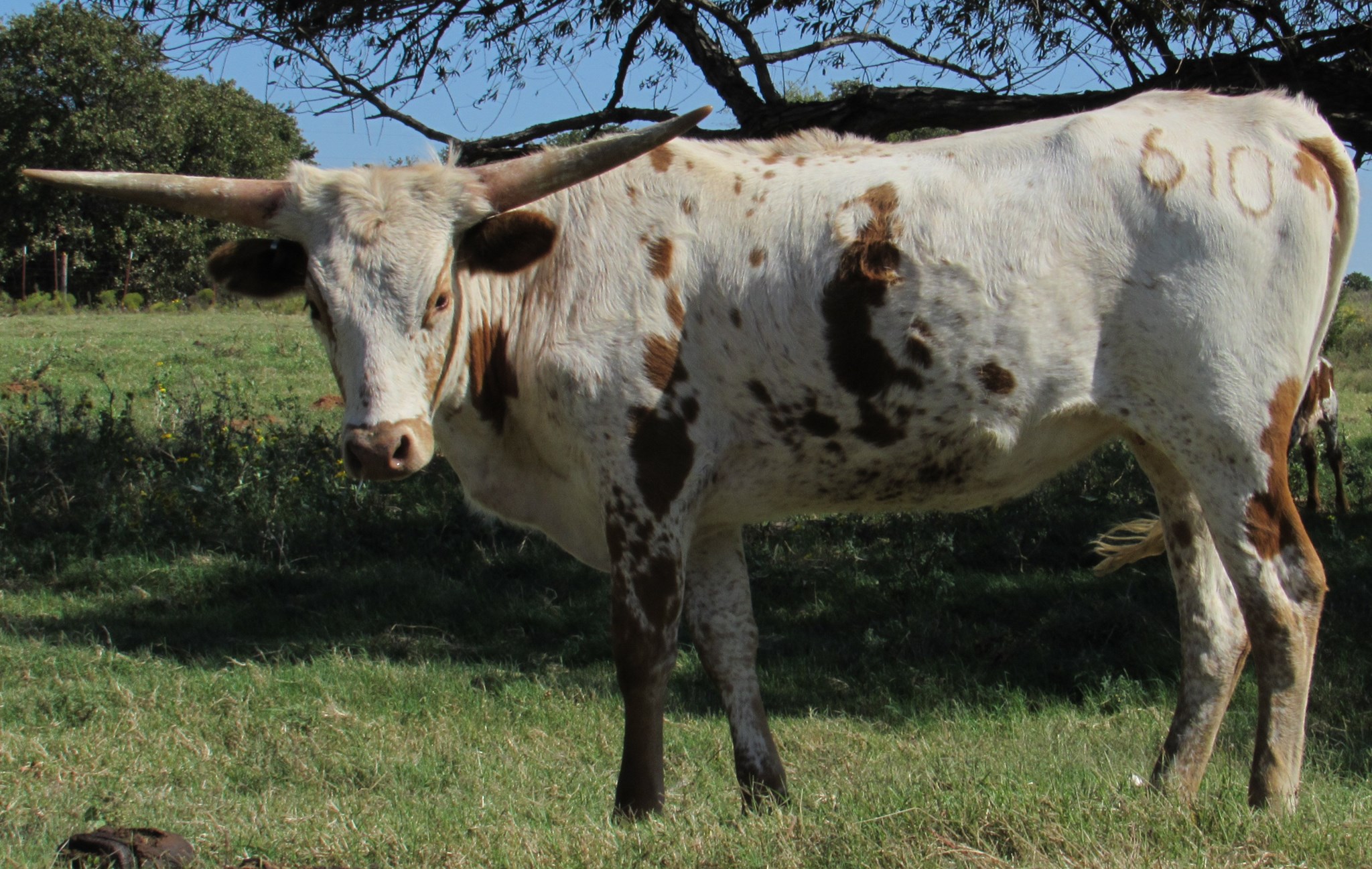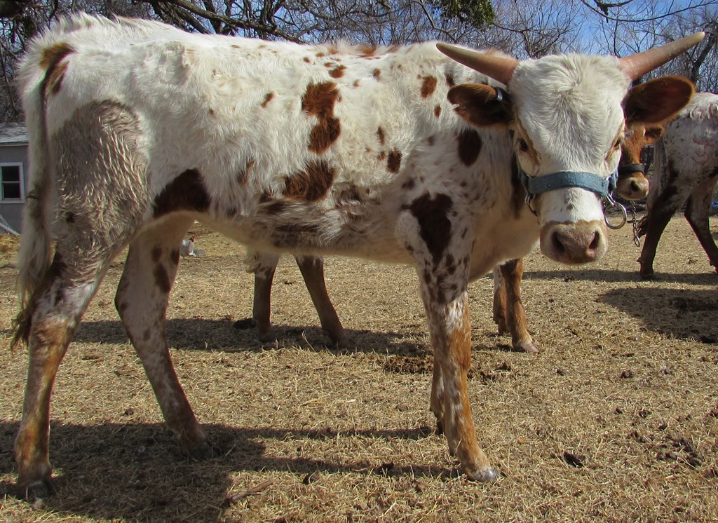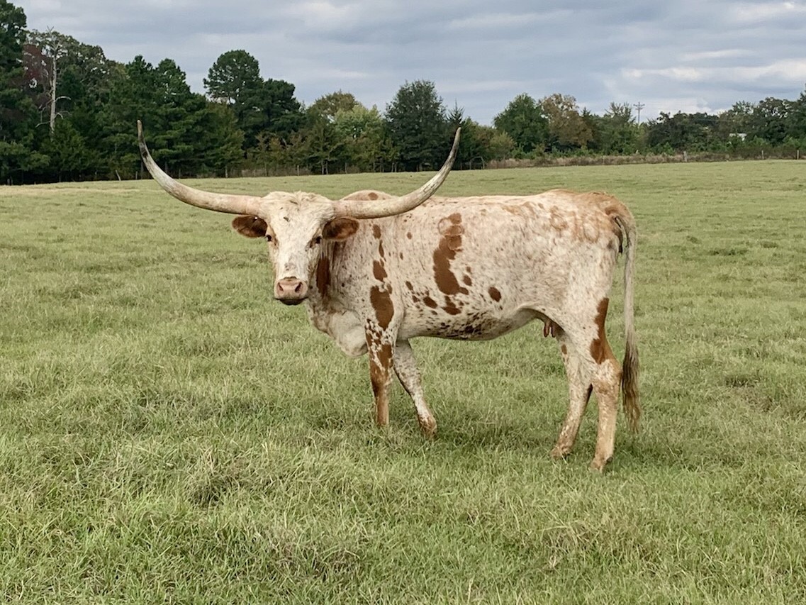 Beautiful young cow that mixes exceptional tip to tip (84+”) on her dams side with award winning total horn (106.75”) on her sire’s. Calm, well behaved, and easy to work.