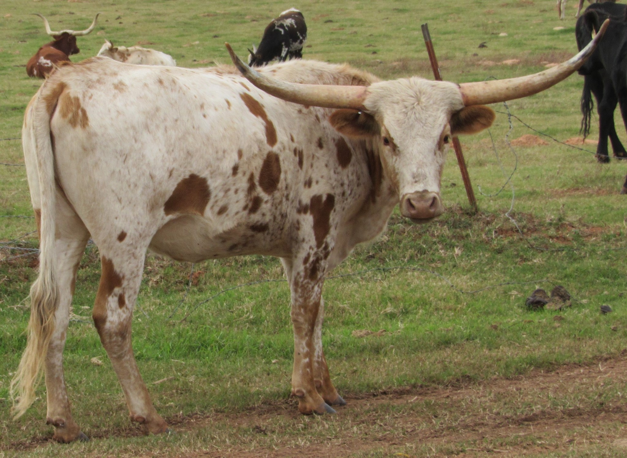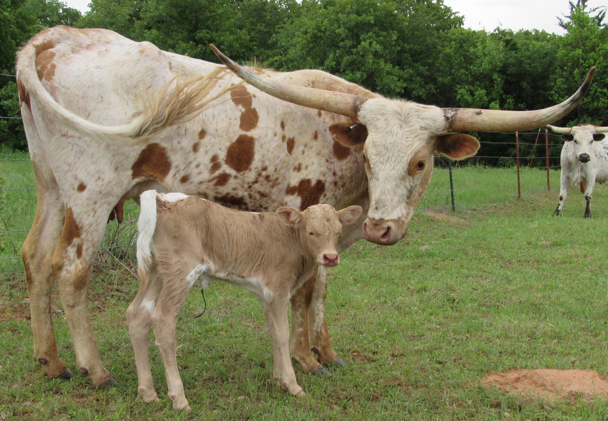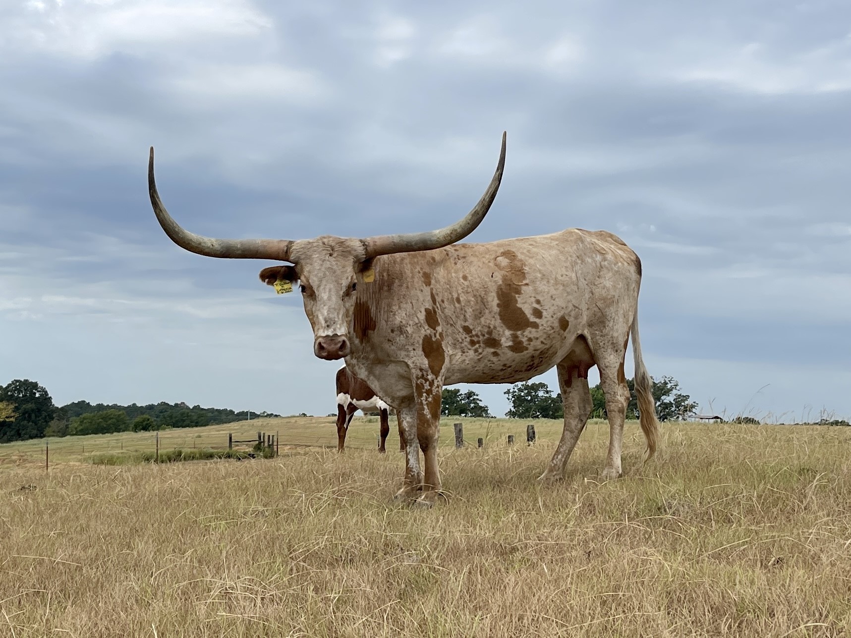 Beautiful young cow that mixes exceptional tip to tip (84+”) on her dams side with award winning total horn (106.75”) on her sire’s. Calm, well behaved, and easy to work.